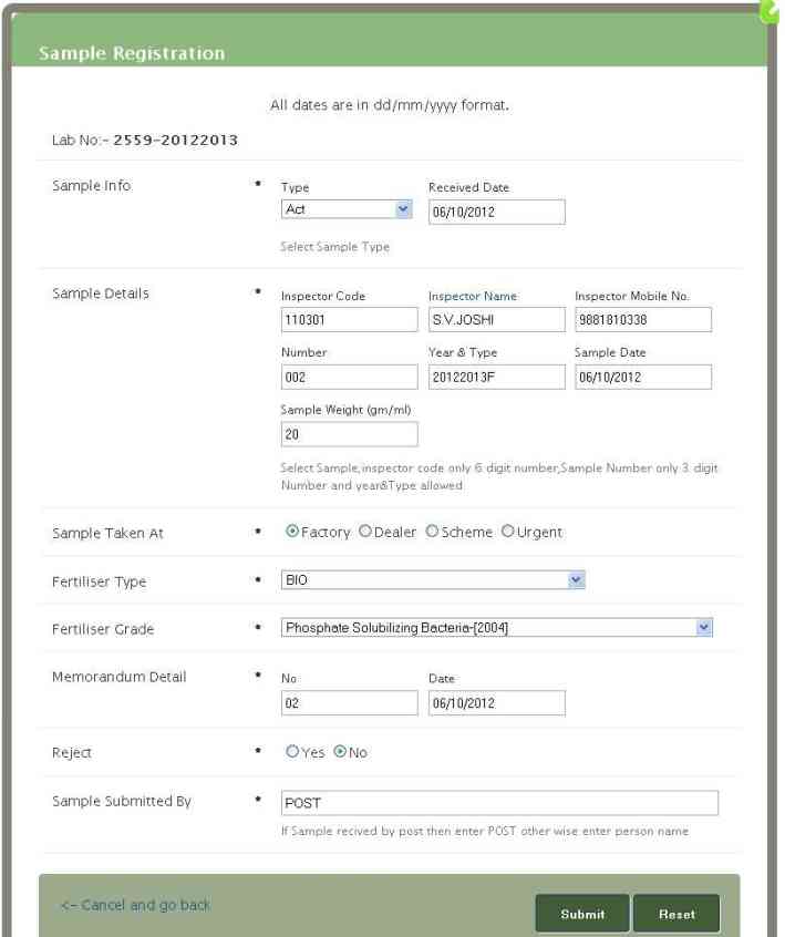 Sample Submitted By-If Sample recived by post then enter POST other wise enter person name