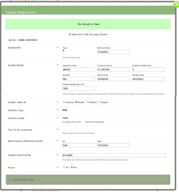 Modify Sample Registered Details page will open