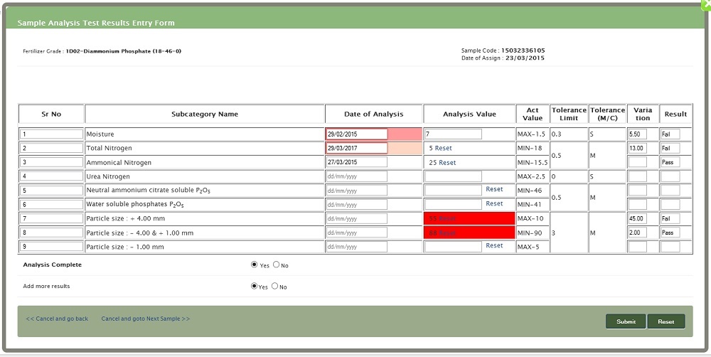 Analysis Complete-Select Yes if analysis is complete with respecitve Sample else select no