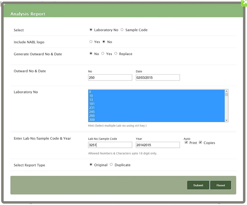 Laboratory No - Select multiple Lab no using ctrl key or you can select single also.