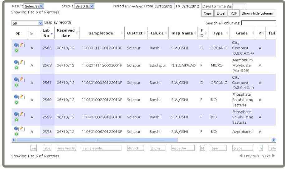 • You can also search individually by Sample type/Lab no/received date/Sample code/District name/Taluka Name/ Inspector name/fd/type/grade/status/code no/analyst name i.e by all columns which are given in above list