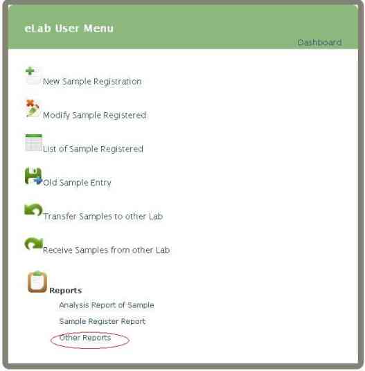 • Click on 'Other Reports' link present on eLab User Menu (as shown)