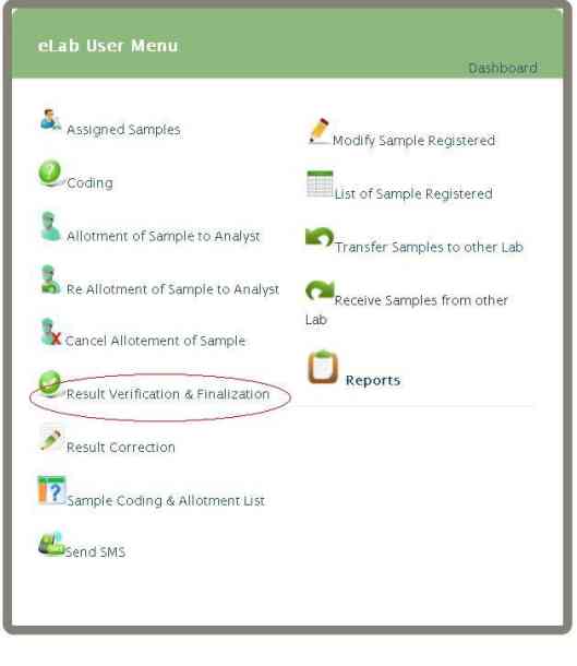 • Click on 'Result Verification & Finalisation' link present on eLab User Menu (as shown)