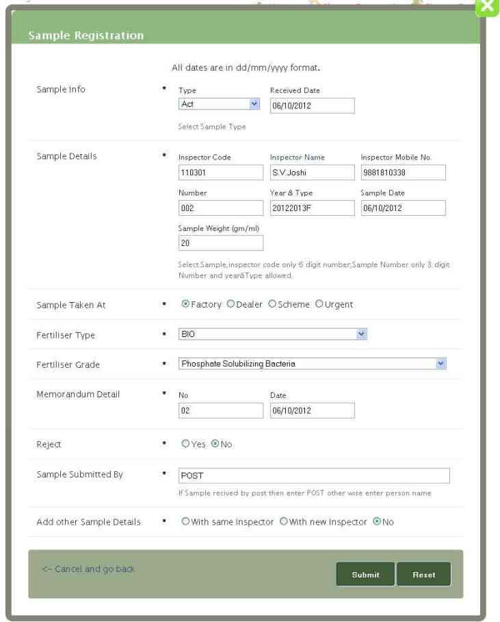 Add other Sample Details-Select appropriate option and click on submit button